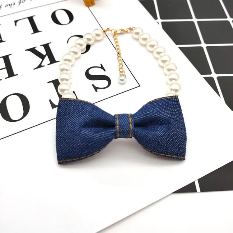 Product Name: Decorazione Collare Per Cani Collana Con Fiocco In Denim Forniture Regolabili Bavaglino Per Gatto Cucciolo Accessori Per Collare Principessa Carino Catena Per Collo Di Perle Animale Domestico