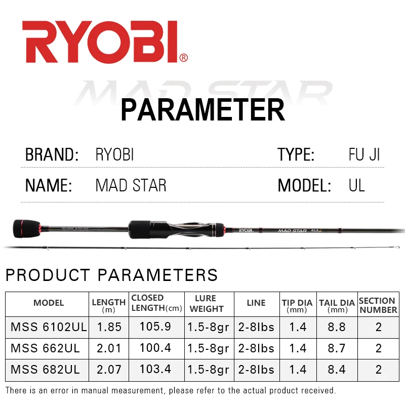 Product Name: RYOBI MAD STAR Spinning Canna Da Pesca UL Lure Rod Canna Da Pesca In Fibra Di Carbonio Fuji A Rings 1.5-8GR Peso Esca 1.85-2.07M Canna Da Pesca