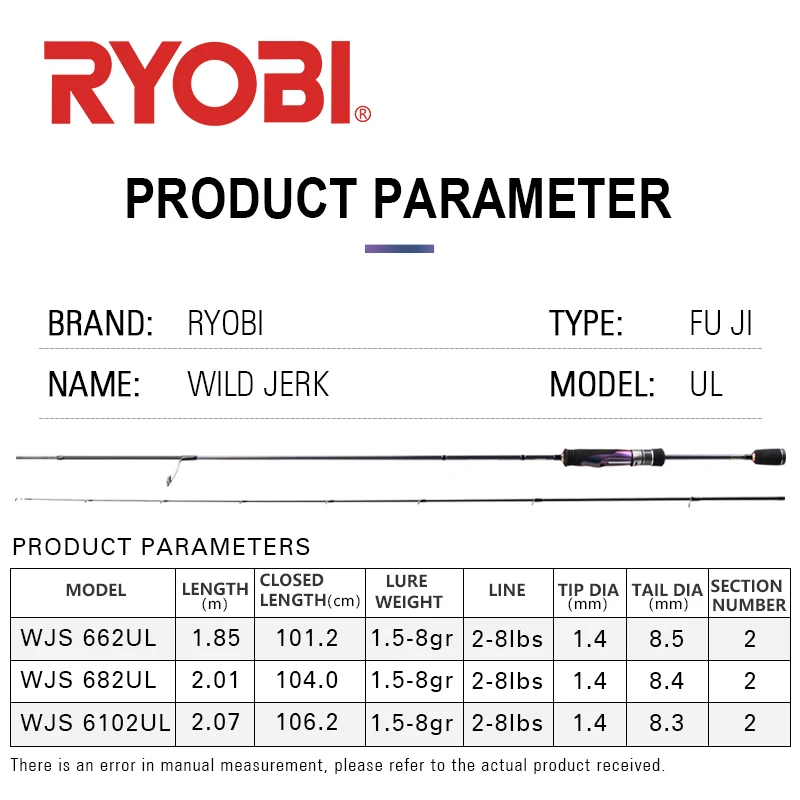 Product Name: RYOBI WILD JER Spinning Canna Da Pesca UL Lure Rod Canna Da Pesca In Fibra Di Carbonio Fuji A Ring 1.5-8GR Peso Esca 1.85M-2.07M Canna Da Pesca